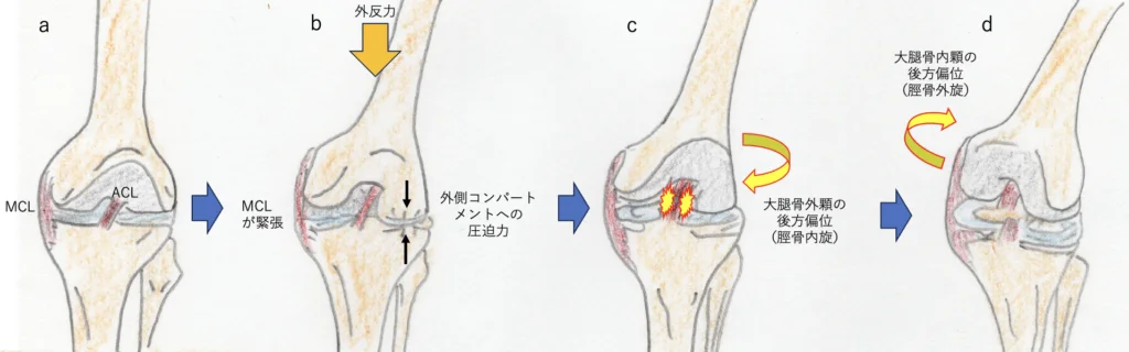 c)この圧迫力により、脛骨の骨形態(脛骨外側高原の後傾)によって大腿骨外顆が後方に偏位することにより脛骨前方移動および内旋が生じ、ACLが断裂する。