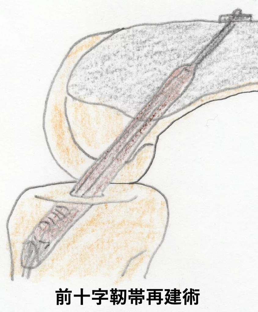 上記の理由から手術適応は前十字靭帯損傷が最も多いのですが、十字靭帯の治療(手術)は自家組織(ハムストリング腱や膝蓋腱など)を用いて再建術が一般的です。手術は関節鏡を用いてできる限り低侵襲で行われています。術後は3~6ヵ月程度のリハビリを行い、徐々にスポーツ復帰となります。