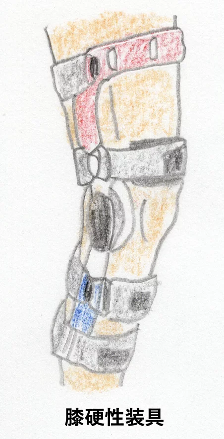 保存療法:膝動揺性抑制装具(サポーター)を装着して早期から痛みの無い範囲で可動域訓練を行い、筋力低下を最小限にとどめるようにします。
