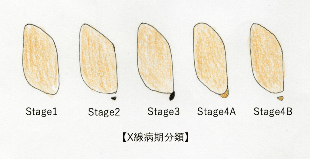 レントゲン写真では5つの病期に分類されます。