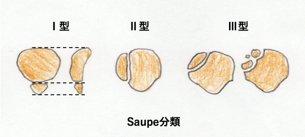 一般的な分類として、分裂骨片の位置によりタイプ別に分けるSaupe分類が用いられます。