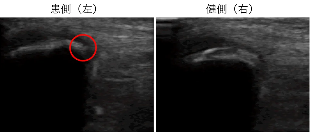 病態把握のため、エコー検査をしたところ、左膝蓋骨の下端部に裂離骨片と思われる画像が描出できました。