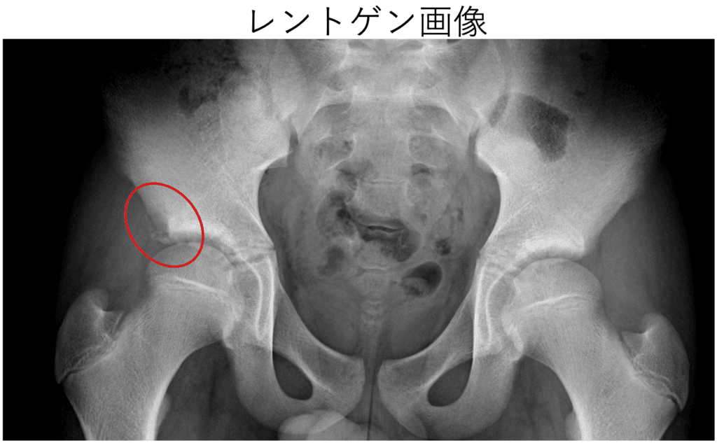 レントゲン写真でもエコー検査をした下前腸骨棘部に裂離骨片像が確認できたため、「下前腸骨棘裂離骨折」と診断されました。